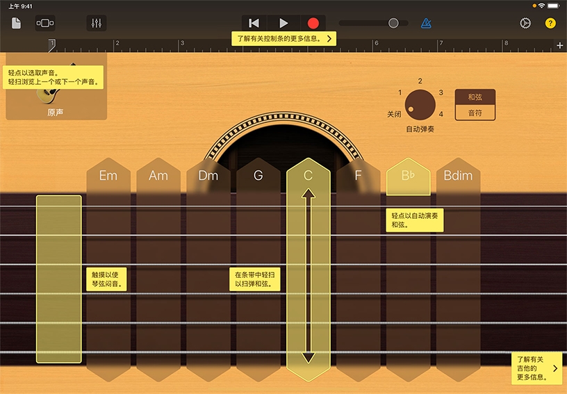 着重突出为首次使用“库乐队”的用户提供的辅助提示。在打开辅助提示的情况下拍摄屏幕快照,然后使用“标记”来添加注释。