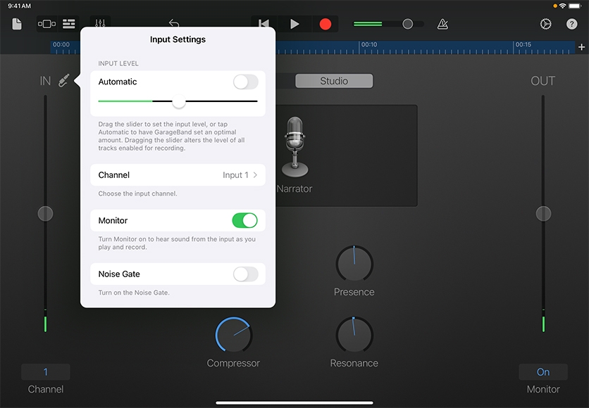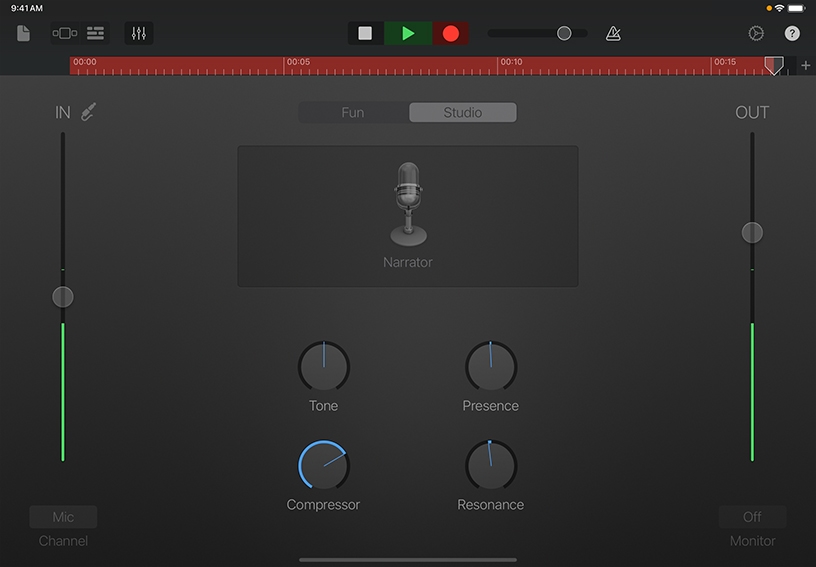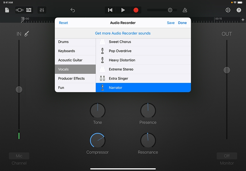 Choose a sound preset. Tap Studio, then tap the microphone in the middle. Scroll to the bottom of the list of presets and tap Narrator, then tap Done.
