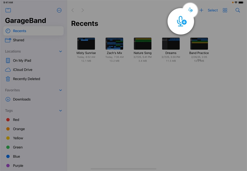 Create a new audio recording. In the My Songs browser, tap New Audio Recording .