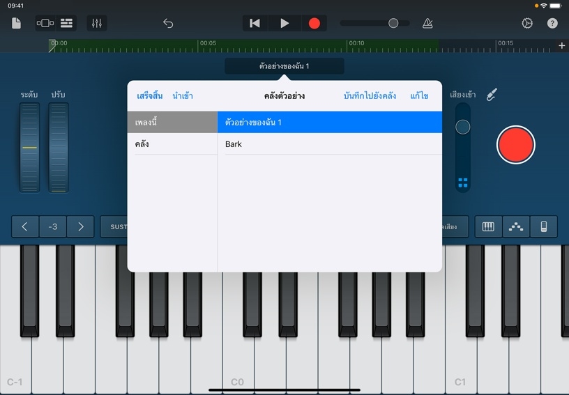 แตะชื่อแซมเพิลเสียงปัจจุบันที่อยู่เหนือการแสดงรูปคลื่นเสียง แตะ "เพลงนี้" แล้วแตะแซมเพิลเสียงที่คุณต้องการบันทึก จากนั้นแตะ "บันทึกไปยังคลัง"