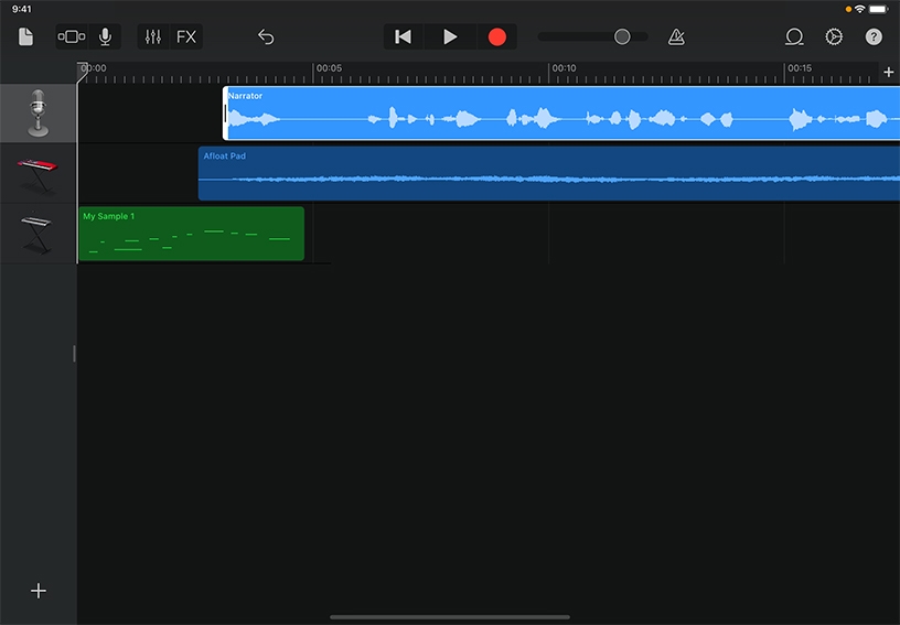 GarageBandで音楽やボーカル、サウンドエフェクトを録音すると、トラック表示画面で音声を視覚化することができます。これを「リージョン」といいます。リージョンをトリミング、分割、アレンジして、作曲したり、音声を使ったプロジェクトを作ることもできます。