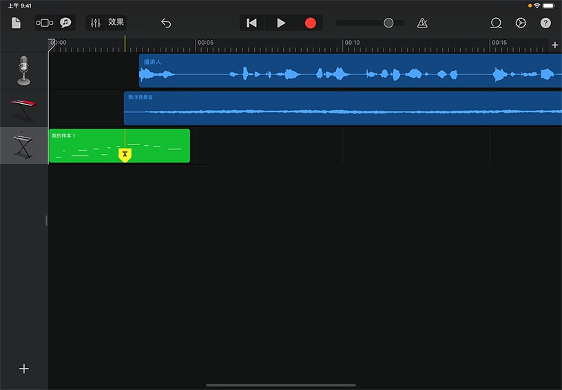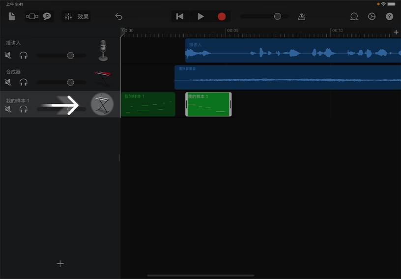 在库乐队中录制音乐、人声或声音效果时,相应的录音 (称为片段) 会以图形方式显示在“轨道”视图的音轨中。你可以修剪、拆分和排列片段来构建乐曲和其他音频项目。