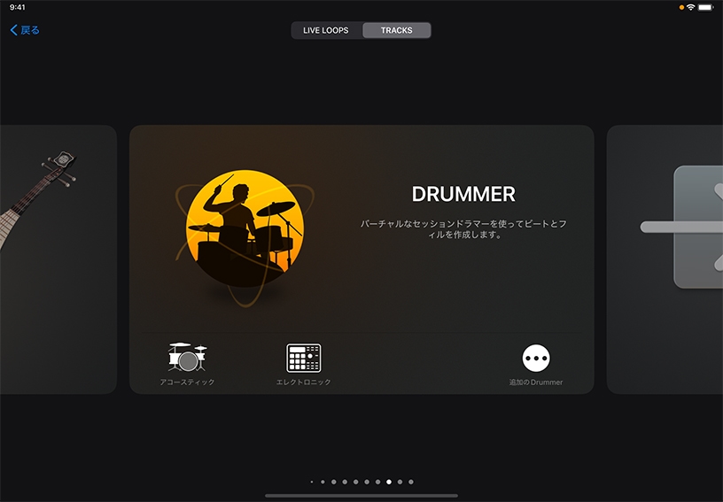 ドラマーを選ぶオーディションをしましょう。新しいプロジェクトを作成し、画面を左右のいずれかにスワイプして「DRUMMER」を表示し、「アコースティック」をタップします。