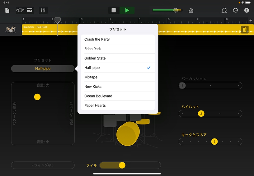再生ボタンをタップして、Kyleの演奏を聴いてみましょう。Kyleの演奏中に「Half-pipe」をタップすると、あらかじめ用意されているリズム(プリセット)が表示されるので、別のプリセットを選んで聞いてみてください。