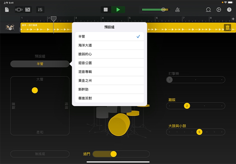 聆聽 Kyle 的演奏。在他演奏時,點一下「半管」,然後點一下以選擇其他預設組。聽聽看,節拍有什麼改變。