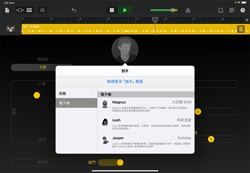 試聽鼓手。建立新的計畫案、滑動至「鼓手」,然後點一下「原聲」。