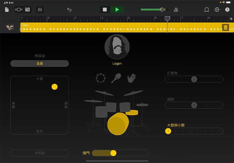 點一下鼓組內容 (例如鐃鈸、嗵嗵鼓和小鼓) 來將其靜音或取消靜音。拖移滑桿來創造出其他節拍變化。