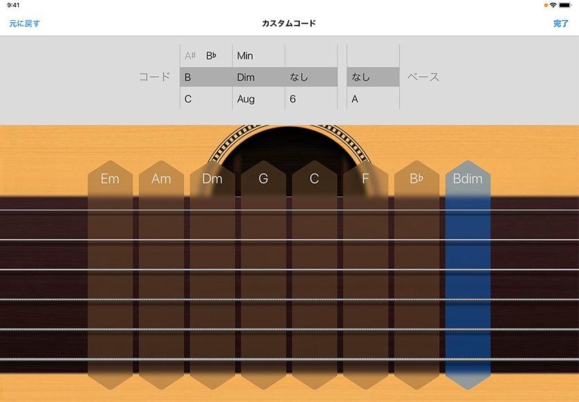 録音したコードを聴いてみましょう。再生ボタンをタップします。イメージと違った場合は取り消すボタン