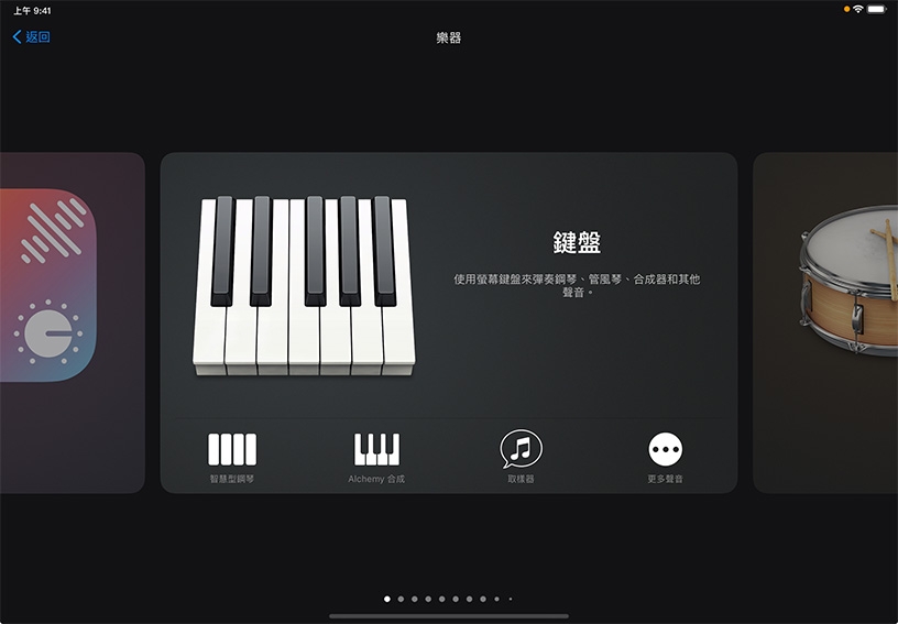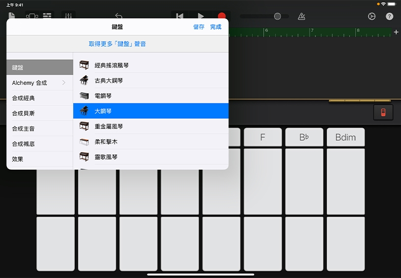 試試不同的鍵盤聲音。點一下「大鋼琴」圖像,然後選擇「經典搖滾風琴」或「柔和擊木」之類的新鍵盤。