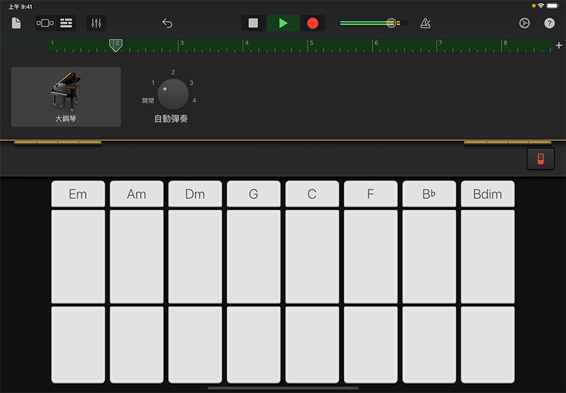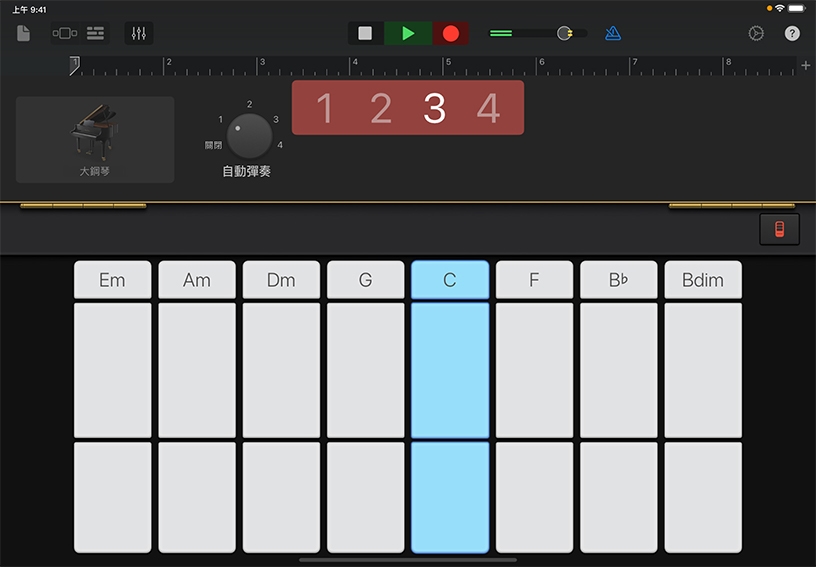 彈奏和弦。將「自動彈奏」轉為「1」,然後點一下 C 和弦條板上的「C」。試著以你覺得悅耳的彈法,輪流彈奏 C 與 G 和弦。