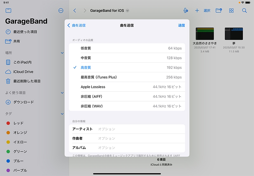 「曲」を選択し、「高音質」>「送信」をタップして、共有方法を指定してください。