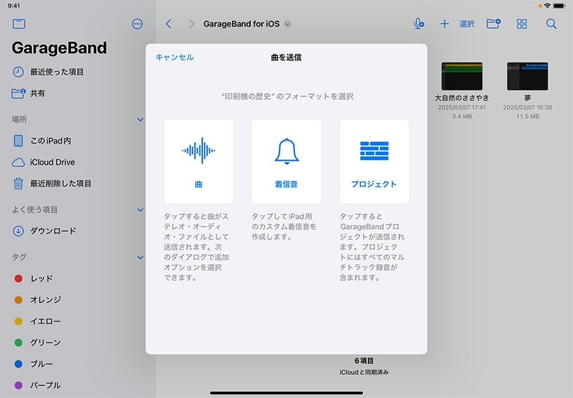 GarageBandのプロジェクトを共有して、ほかの人が編集できるようにしましょう。共有する時は、フォーマットを選択する画面で「プロジェクト」を選択し、共有方法を指定します。