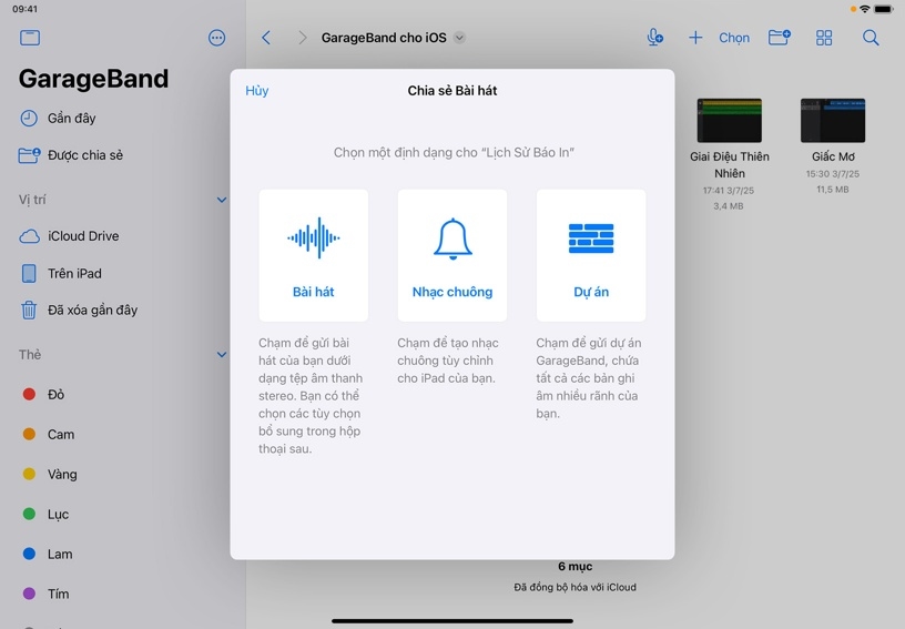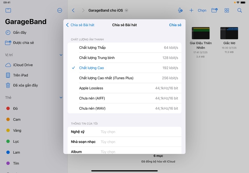 Chia sẻ dự án GarageBand để người cộng tác khác có thể sửa. Khi chia sẻ, chọn Dự Án làm định dạng, rồi chọn tùy chọn chia sẻ.