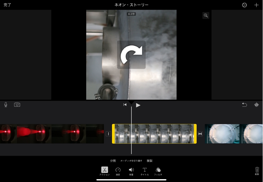 横向きや逆さまになっているクリップを回転させて、向きを調整することができます。再生エリアでビデオの上に2本の指を置き、ダイヤルを回すように手を動かしてください。