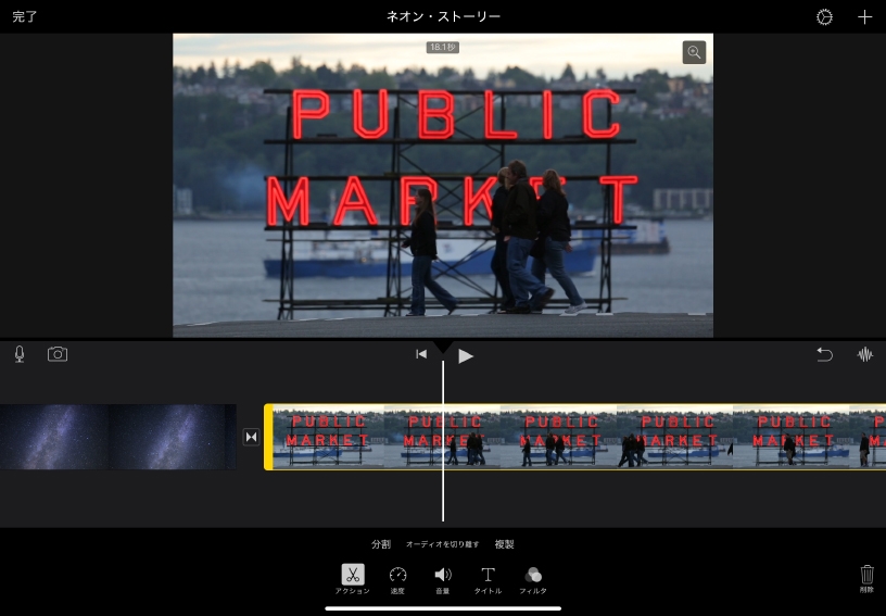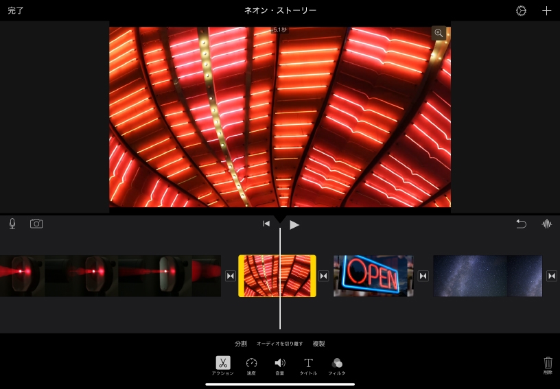 クリップを分割してみましょう。クリップの中の分割したい位置を再生ヘッドに合わせます。クリップを選択して、「アクション」ボタン>「分割」の順にタップします。これで、分割したセクションを個別に編集できるようになります。