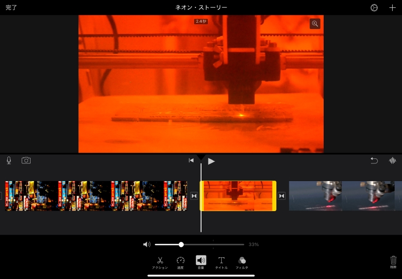 クリップの音量を調整しましょう。クリップを選択し、「音量」ボタンをタップして、音量スライダをドラッグします。スライダの左側のミュートボタン