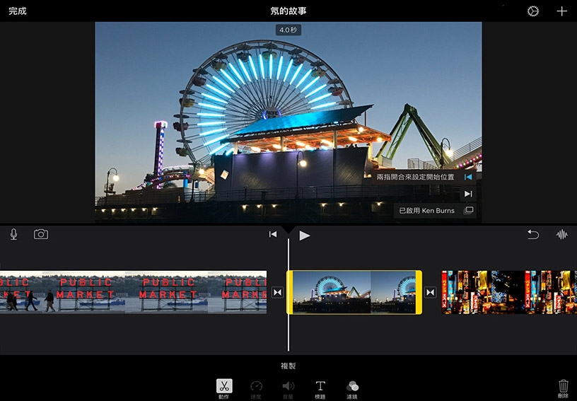更改 Ken Burns 效果的速度。選取照片後,使用黃色裁剪控點來延長或縮短剪輯片段。