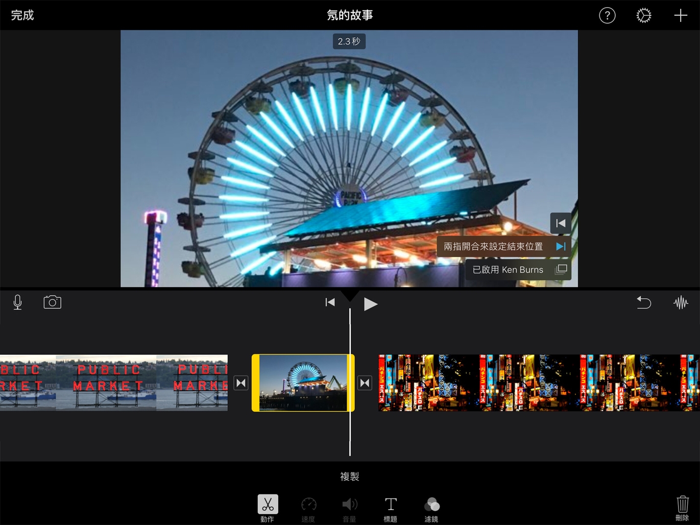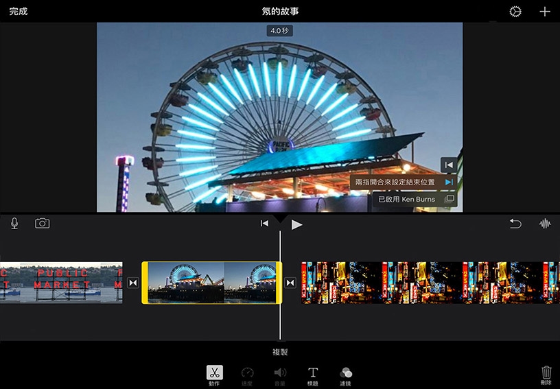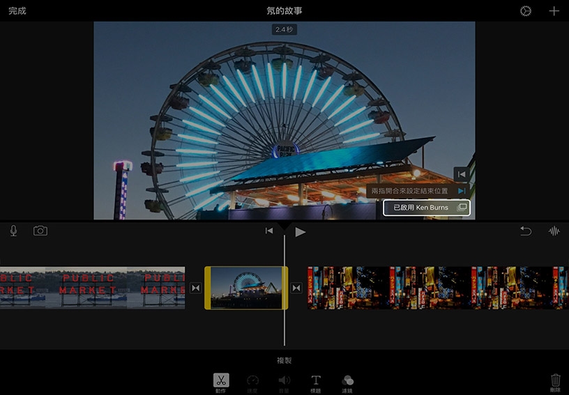 ,然後以兩指開合或拖移,以設定照片在結尾處要顯示的方式。