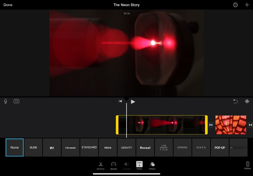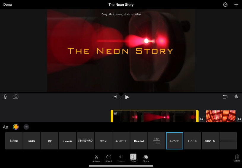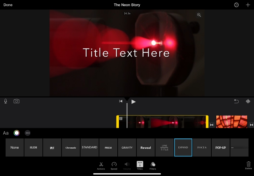 Add a title to a clip. Select the clip in the timeline, then tap Title in the inspector. Tap a title style to apply it.