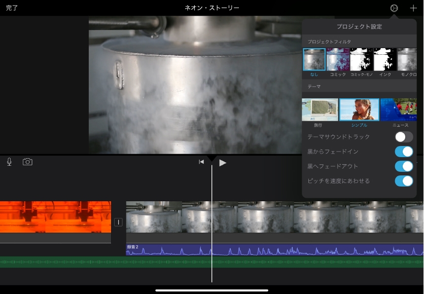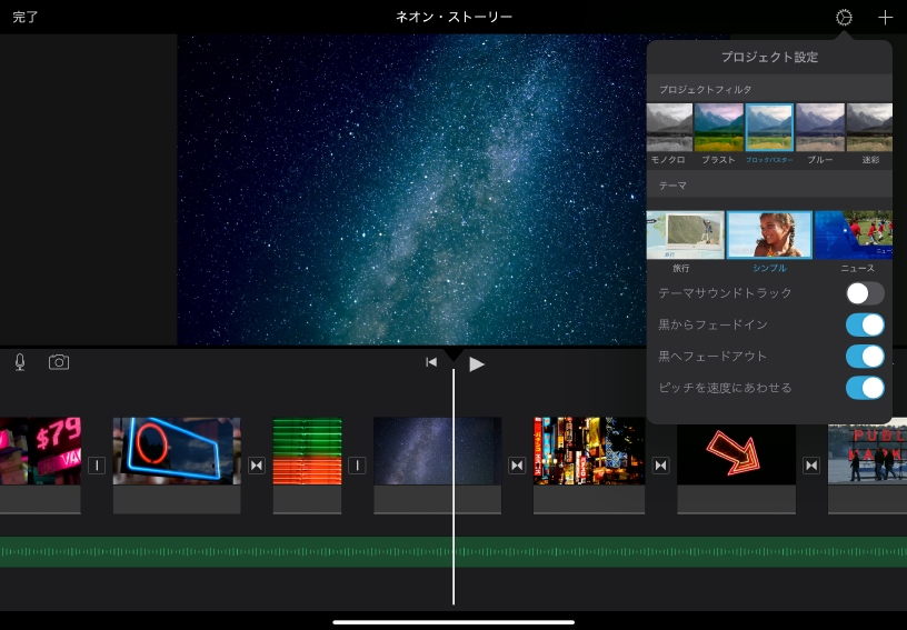 プロジェクトに使われているすべてのクリップにフィルタを適用してみましょう。プロジェクト設定ボタンをタップして、「プロジェクトフィルタ」を選択してください。