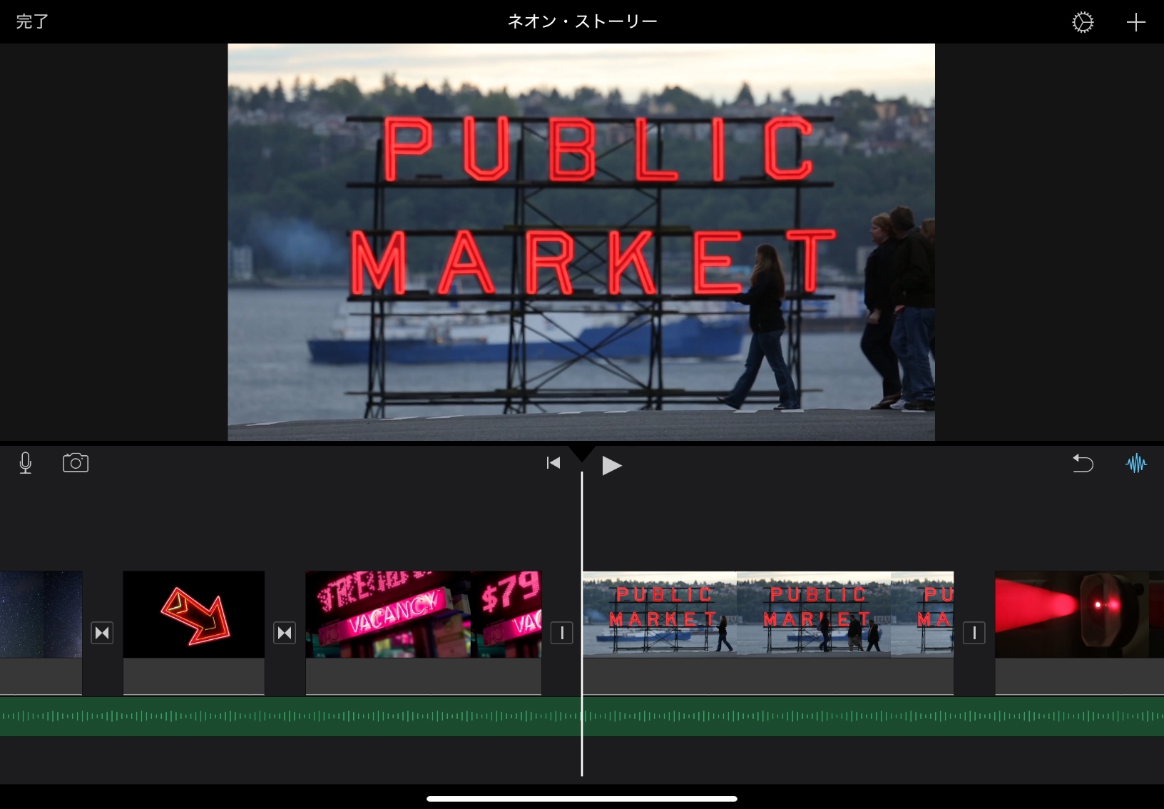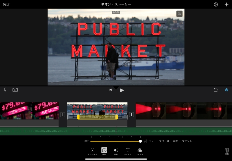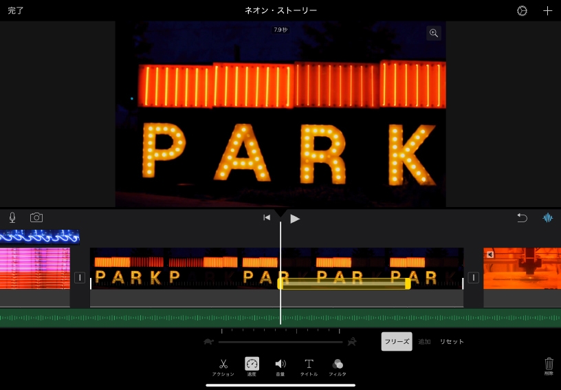 映像を静止させてみましょう。ビデオクリップの中から静止させたい箇所を選んで、再生ヘッドに合わせてください。次に、クリップを選択して「速度」ボタンをタップし、「フリーズ」をタップします。