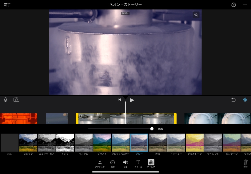 ビデオフィルタを追加してみましょう。タイムラインでクリップを選択してから、「フィルタ」ボタンをタップしてフィルタを1つ選択します。スライダをドラッグしてフィルタの強度を変えてください。