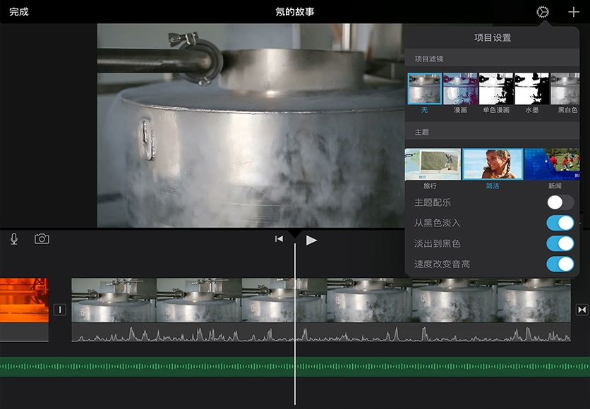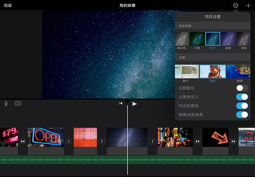 将滤镜应用于项目中的所有片段。轻点项目“设置”,然后选择一个项目滤镜。