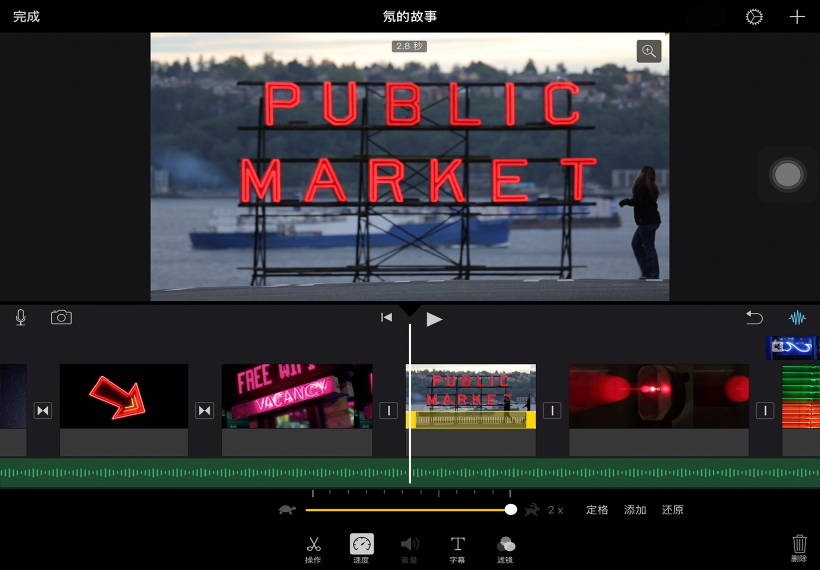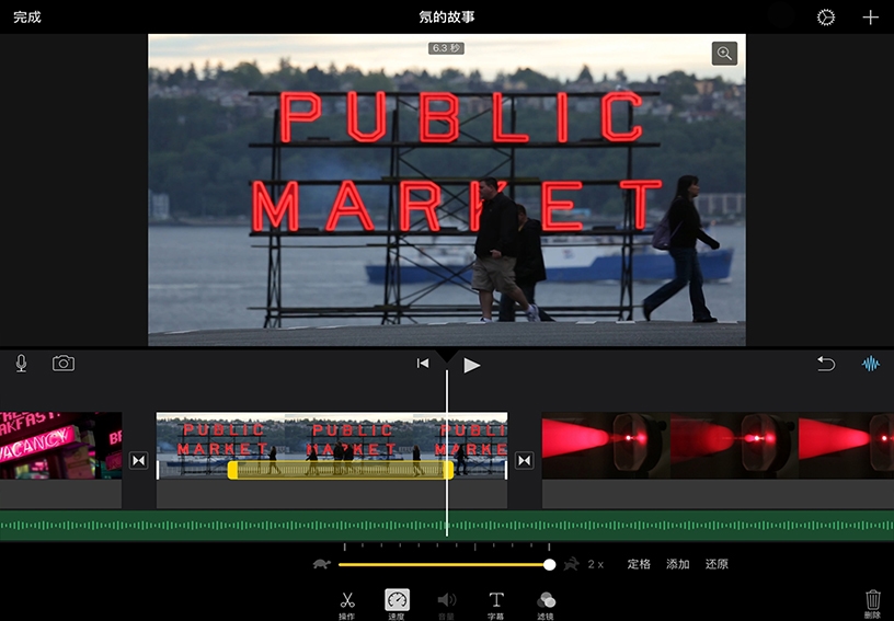 添加慢动作或快动作效果。选择时间线中的片段,然后轻点“速度”。在检查器中,向右拖动滑块可加快片段播放速度,向左拖动则可减慢片段播放速度。