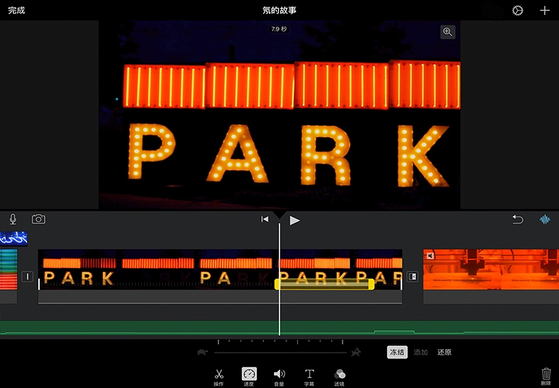 创建静帧。将播放起点放在片段中要定格的画面上。选中片段,轻点“速度”,然后轻点“定格”。
