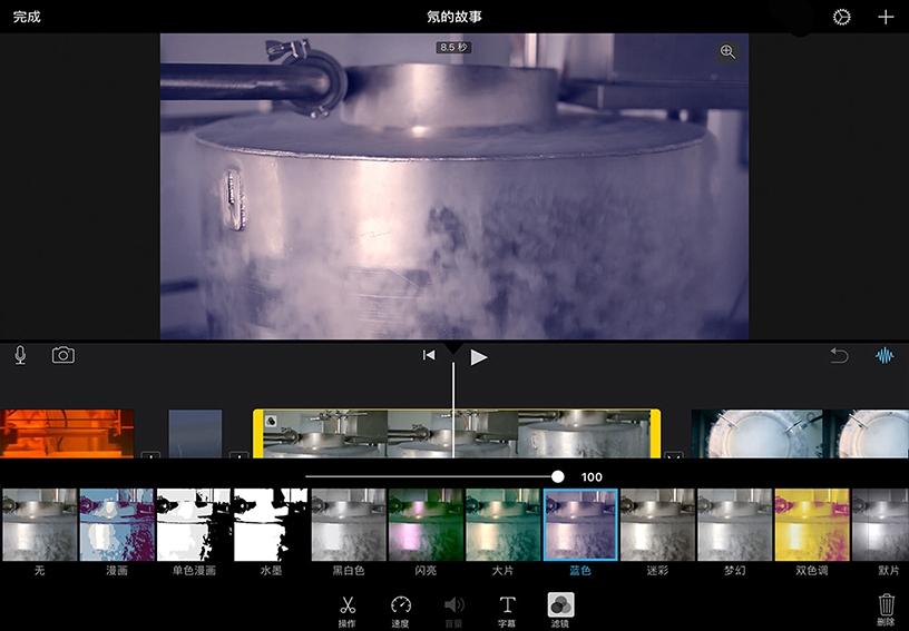 添加视频滤镜。在时间线中选择一个片段,轻点“滤镜”,然后轻点一个滤镜。拖动滑块可更改滤镜强度。