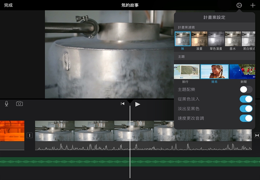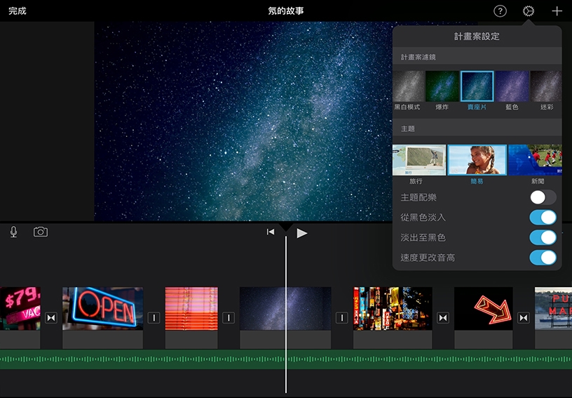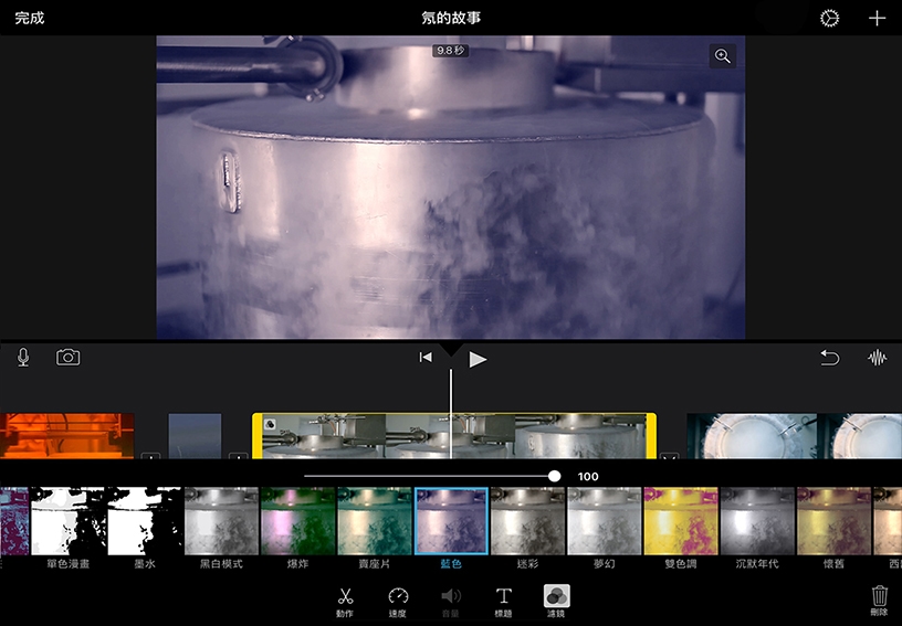 加入影片濾鏡。選取時間列中的剪輯片段、點一下「濾鏡」,然後點一下一種濾鏡。拖移滑桿來更改濾鏡強度。