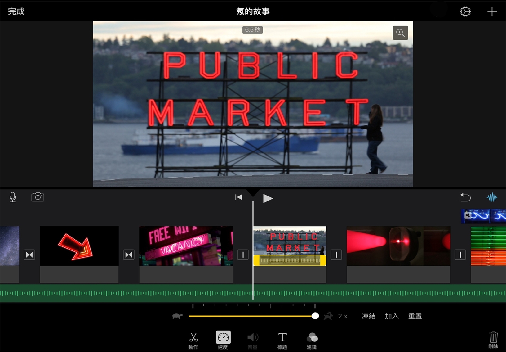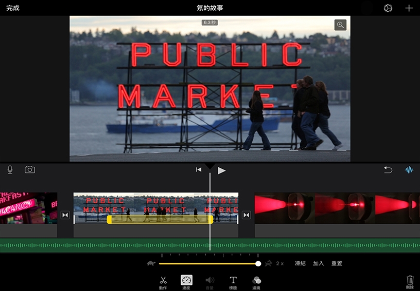 加入慢動作或快動作效果。選取時間列中的剪輯片段,然後點一下「速度」。在檢閱器中,向右拖移滑桿以加快剪輯片段,或向左拖移以放慢。