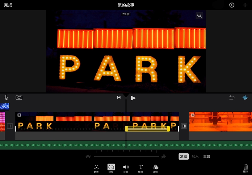 製作凍結影格。針對要凍結的剪輯片段,將播放磁頭放置在其影格上方。選取剪輯片段、點一下「速度」,然後點一下「凍結」。