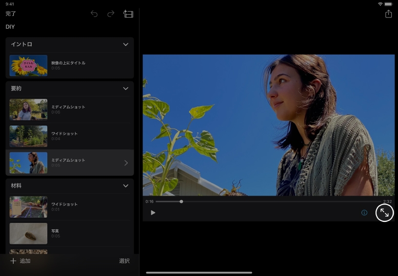 ムービーをプレビューしてみましょう。「フルスクリーンで再生」ボタンをタップすると、ムービーがフルスクリーン表示で再生されます。