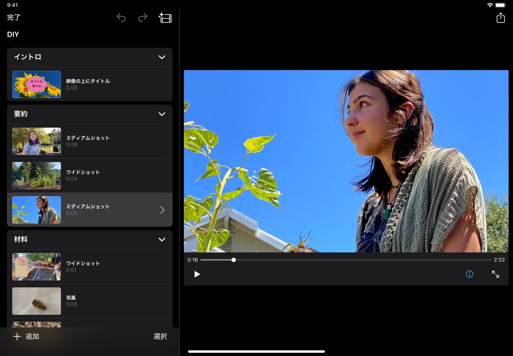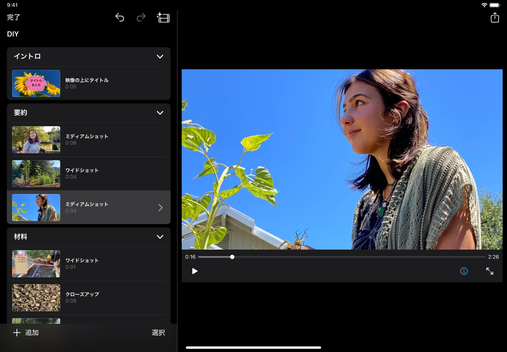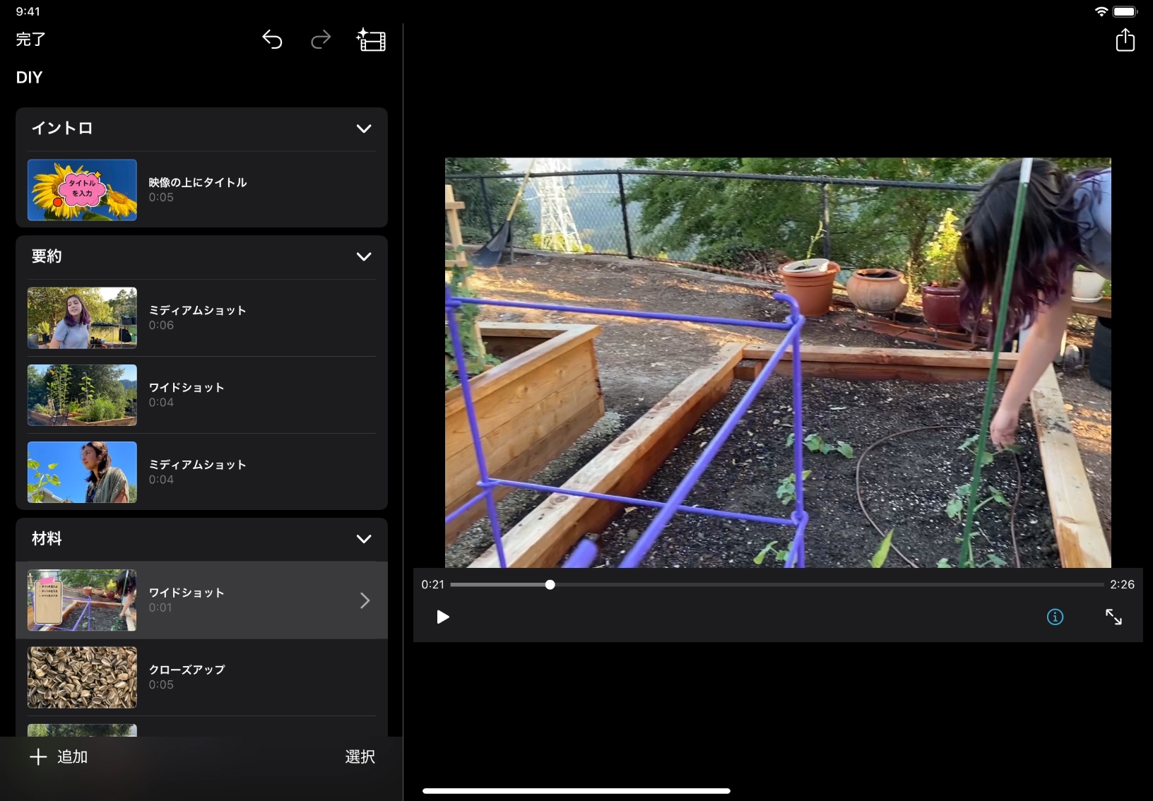 プレースホルダ以外の場所にビデオクリップまたは画像を追加してみましょう。「追加」ボタン>「ライブラリから選択」の順にタップして、追加するビデオクリップまたは写真をタップします。