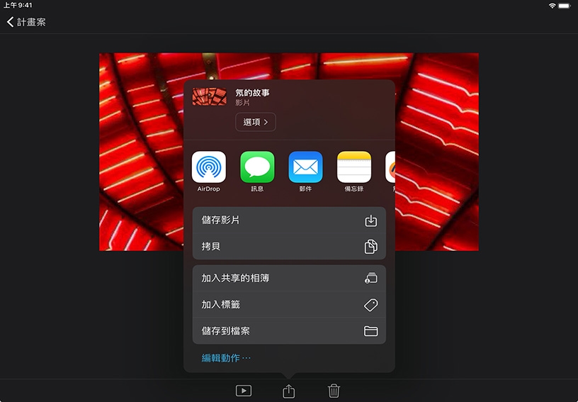 ,然後點一下「儲存或分享影片」。點一下標題正下方的「選項」、選擇解析度,然後點一下「完成」。點一下「儲存影片」,即可將影片儲存到照片圖庫。