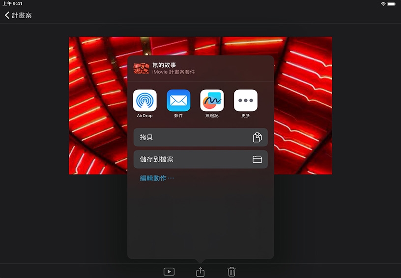 iMovie 讓你能以多種方式與其他人分享影片計畫案。你可以使用 AirPlay 在大螢幕上展示完成的影片、將影片張貼在學校網站上,或是以電子郵件或文字訊息的附件形式傳送。