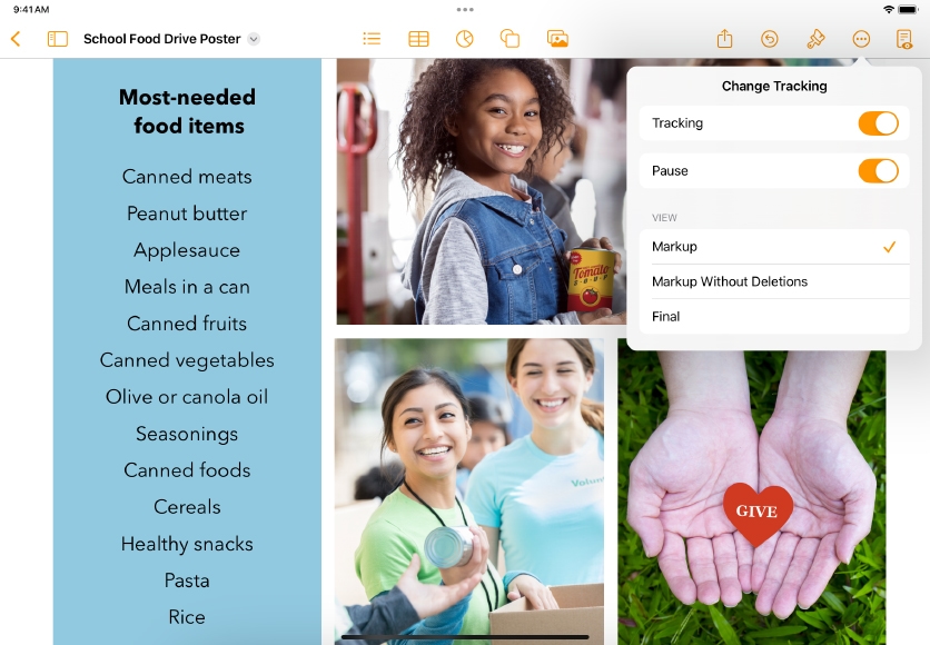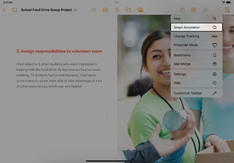 With Smart Annotations, you can mark up and add feedback to Pages documents. Annotations stay connected to marked‑up objects as revisions are made so coauthors can review, track, and incorporate changes.