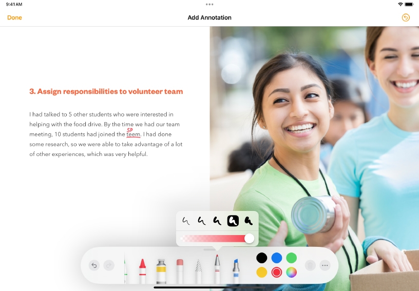 Add an annotation. Use the annotation tool to mark up the document. Choose Pen or Highlighter and change the width and opacity of your marks.