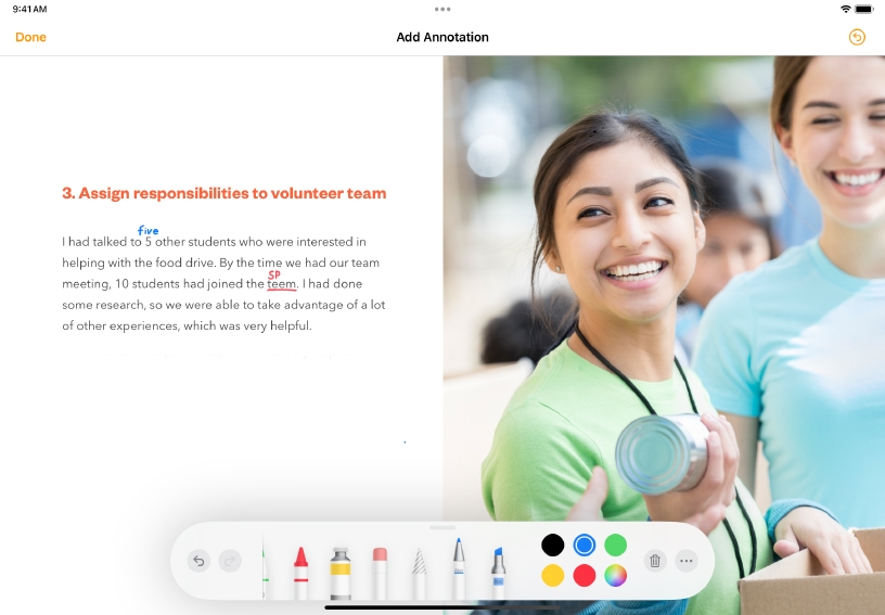 Engage in multiple rounds of collaborative feedback on a writing assignment using Smart Annotations. Ask each contributor to annotate in a different colour.