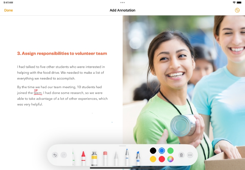 Support reading comprehension and critical thinking using Smart Annotations. Mark up a paragraph in Pages, applying a different colour for vocabulary, questions, connections, and inferences.