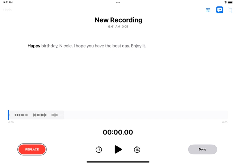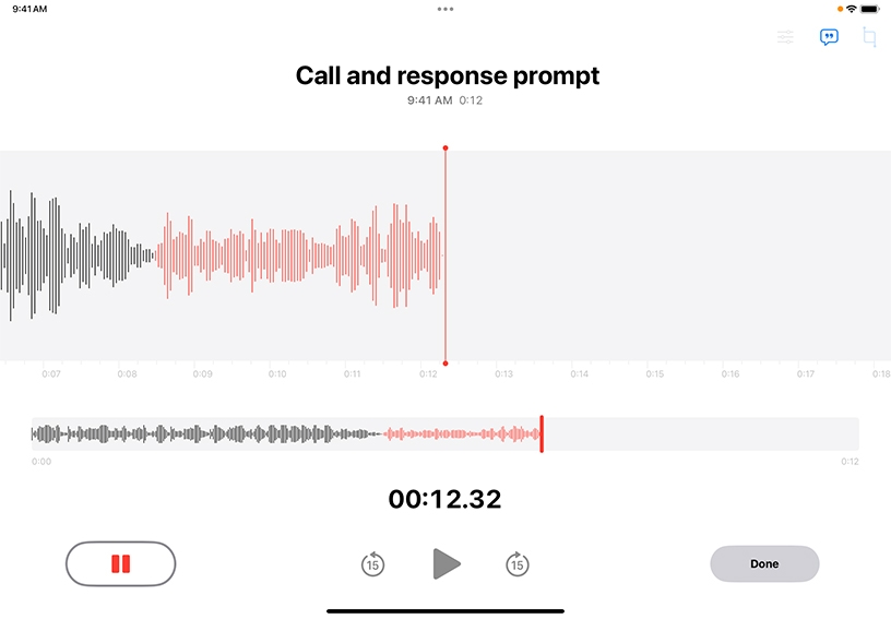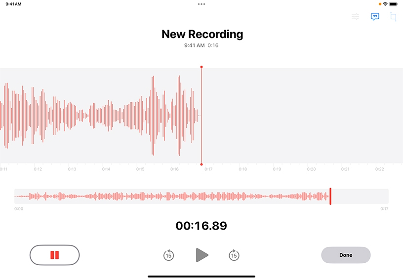 Add more to a recording. Drag the waveform left so that the playhead is positioned at the end of the recording, then tap Resume to continue recording.