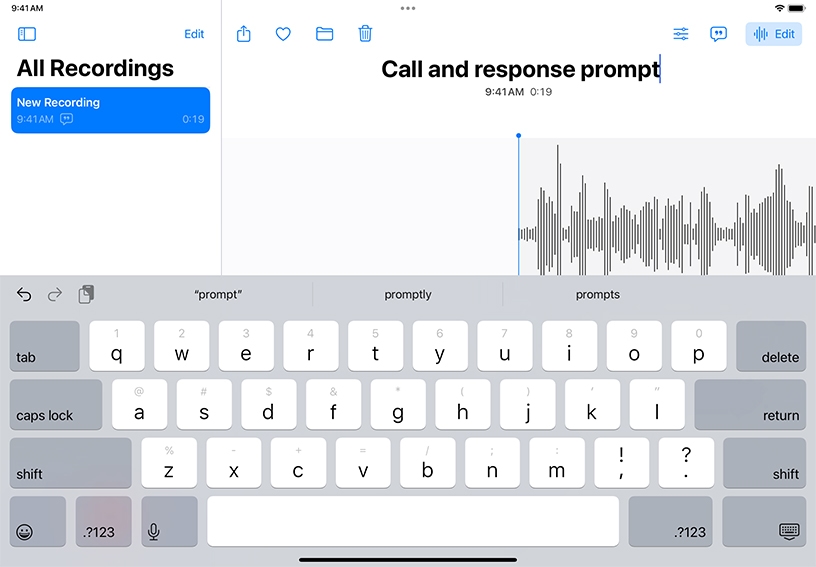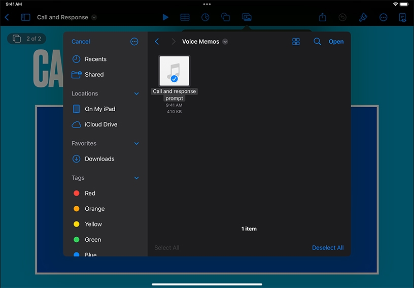 Add Voice Memo recordings to projects. In Pages, Keynote, or Numbers, tap Media