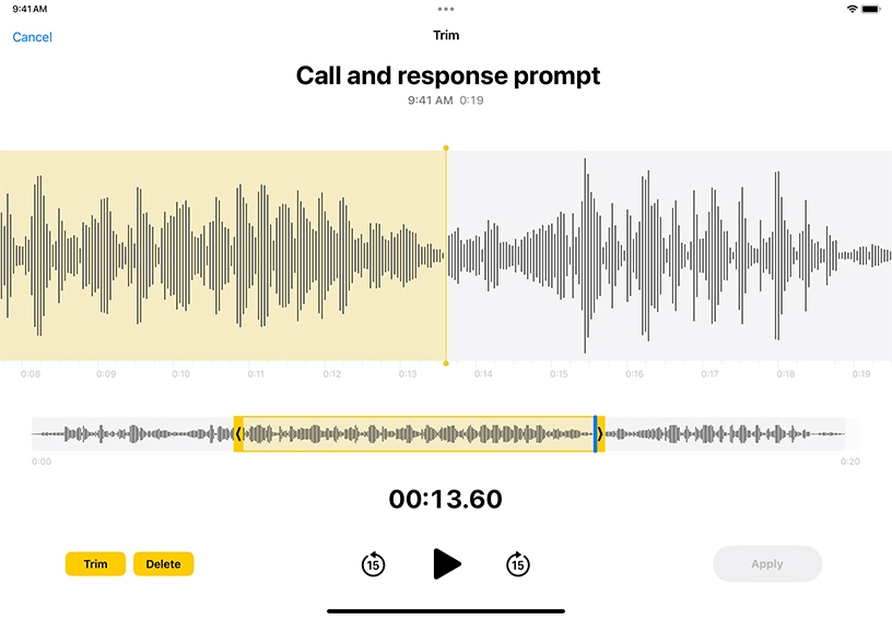 and drag the yellow handles to enclose the section of the waveform you want to keep. When you’re finished, tap Trim, then tap Apply.