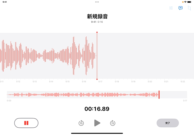 録音した音声に続きを追加してみましょう。波形を左側にドラッグして、録音した音声の最後に再生ヘッドが来るようにし、「再開」をタップして録音を続けます。