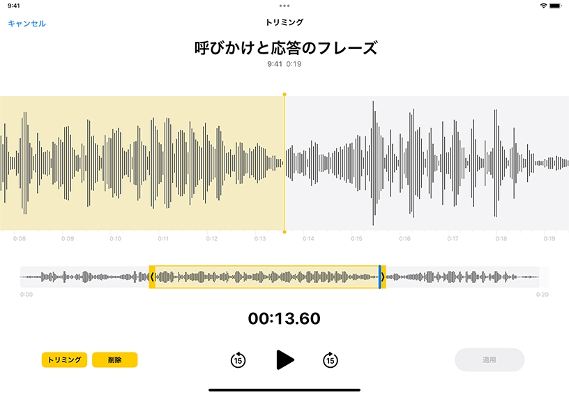 録音した音声をトリミングしてみましょう。「編集」>トリミングツールの順にタップしてから、黄色のハンドルをドラッグして、波形の中の残したい部分を囲みます。トリミングが終わったら、「トリミング」>「保存」の順にタップします。