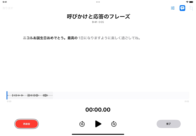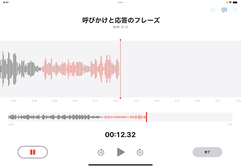 自分の声や周囲の物音を録音してみましょう。「ボイスメモ」を開いて、iPadを音源に近づけ、録音ボタンをタップしてください。録音が終わったら「完了」をタップします。再生ボタン