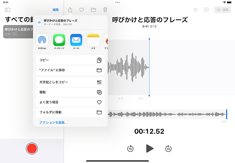 録音した音声を共有してみましょう。ボイスメモの一覧の中から1つを選び、共有ボタンをタップします。録音した音声をiMovieや「メモ」などのアプリに直接送信したり、「ファイル」に保存してほかのアプリで利用したりできます。