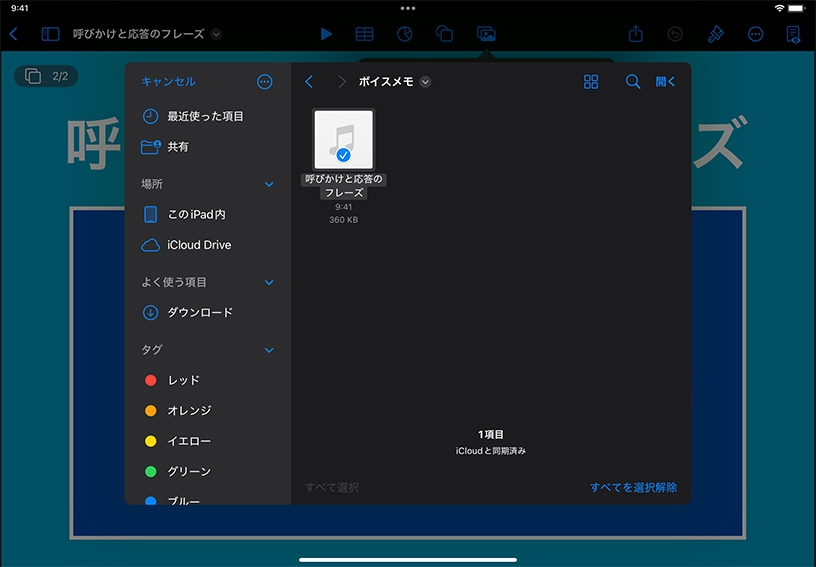 ボイスメモをドキュメントに追加してみましょう。Pages、Keynote、Numbersのいずれかで、メディアボタンをタップします。「挿入元」をタップし、iPadまたはiCloud Drive内にあるボイスメモを選択します。