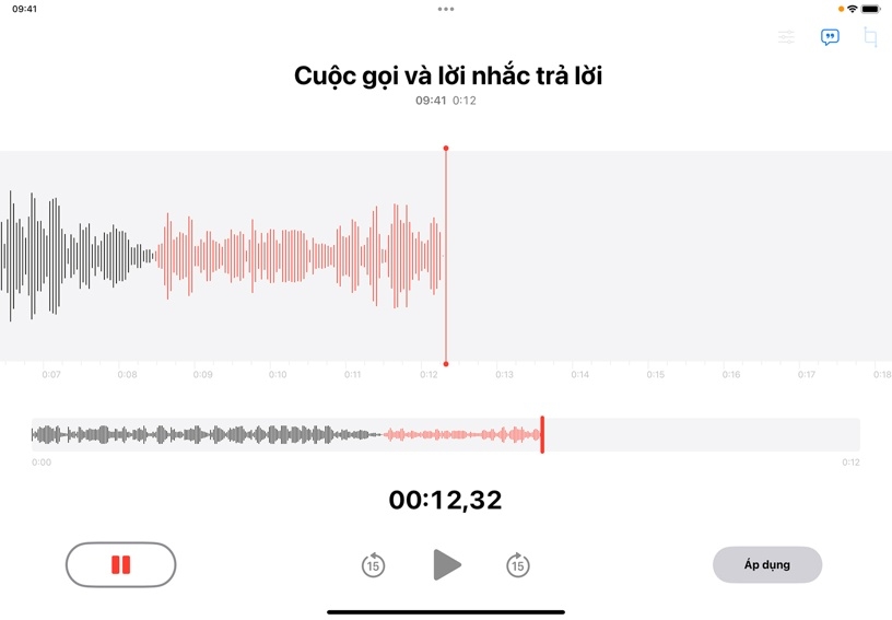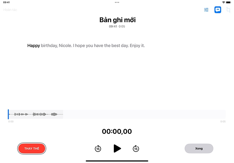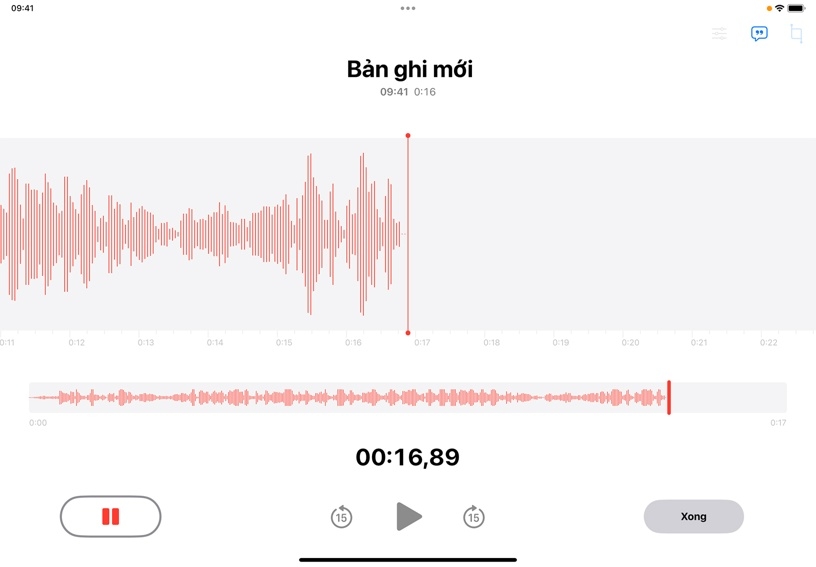 Thêm nhiều nội dung khác vào bản ghi. Kéo dạng sóng sang trái để đầu phát nằm ở cuối bản ghi, sau đó chạm vào Tiếp Tục để tiếp tục ghi.